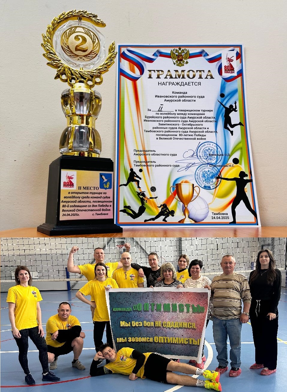 24 апреля 2025 года в физкультурно-оздоровительном комплексе с. Тамбовка Тамбовского округа Амурской области состоялся товарищеский турнир по волейболу между командами Бурейского районного суда Амурской области, Ивановского районного суда Амурской области, Завитинского - Октябрьского судов Амурской области и Тамбовского районного суда Амурской области, посвященный 80-летию Победы в Великой Отечественной войне. По итогам напряженной борьбы, первое место одержала команда Завитинского - Октябрьского судов Амурской области, второе место заняла команда Ивановского районного суда, третье место отвоевали хозяева турнира. И игроки, и болельщики получили заряд энергии на трудовые будни и массу положительных эмоций. Коллектив Ивановского районного суда поздравляет команды с победой!!! ![]() |